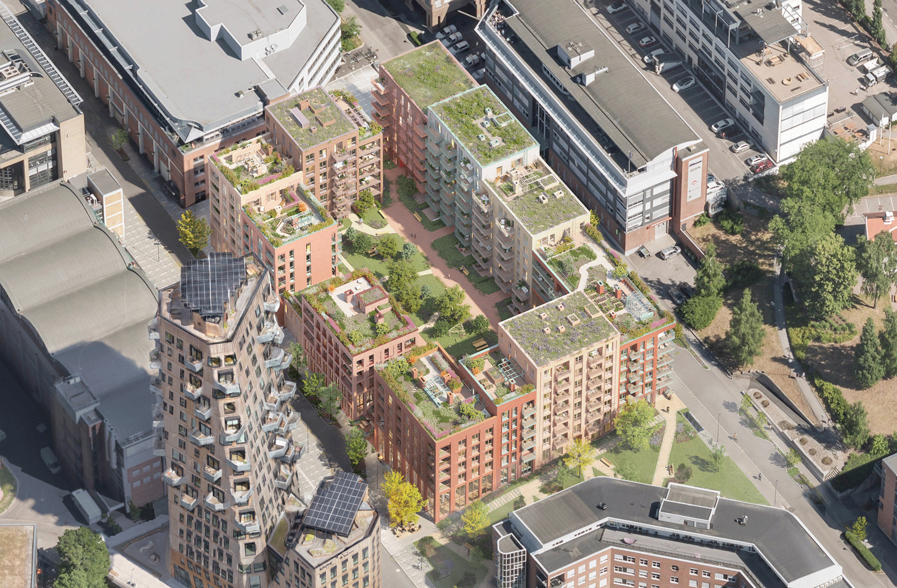 Uteoppholdsarealet løftes videre opp på takene, der flere takhager gir rom for både aktivitet og ro. Her planlegges langbord for fellesmåltider, gressplen å strekke seg ut på og en sone med apparater for enkel egenvektstrening. Elementene kan brukes til både trening, lek og som uformelle sitteplasser. Slik skapes grønne møteplasser for velvære, opplevelser og fellesskap – på tvers av alder.